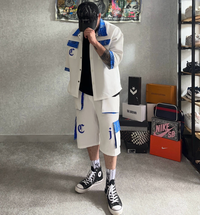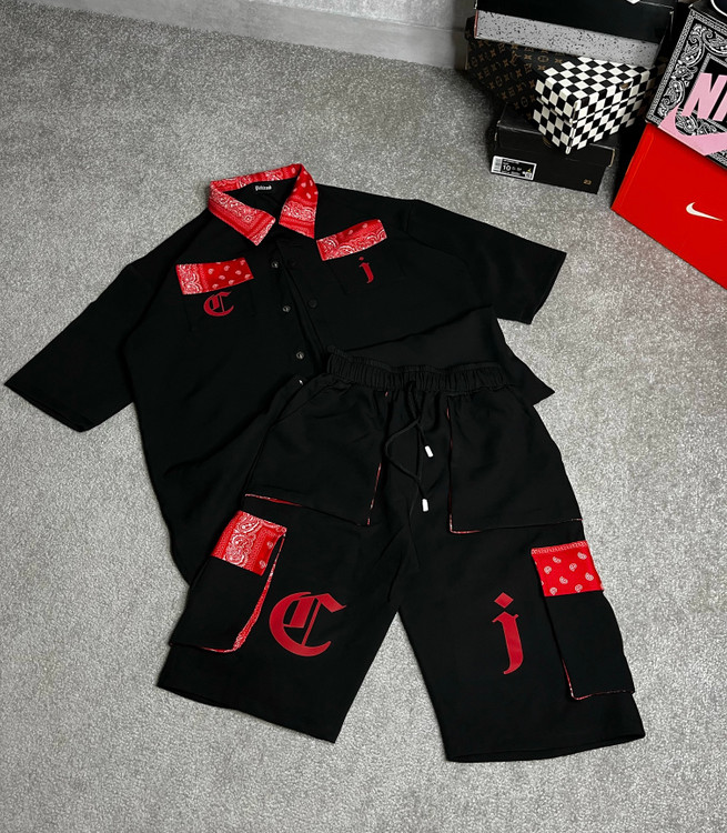 ست یونیسکس شلوارک کارگو و پیراهن آستین کوتاه اولداسکول با دیزاین باندانا